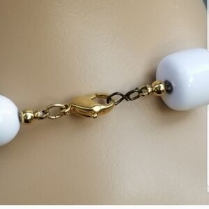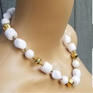 Vintage statement necklace composed of white and goldtoned beads of different shapes and sizes. Necklace measures 18 inches in length and has a large spring clasp closure.