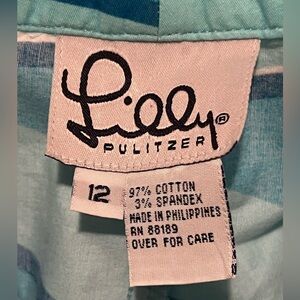 Lilly Pulitzer VINTAGE yellow and blue beach stretch print capri pants size 12. These adorable pants feature an allover light blue, white and royal blue wave print with yellow accents with suns, shells, beach umbrellas, and beach chairs. Button and zip fly with one small pocket at front waist. 97% cotton 3% spandex. EUC with minor wear.