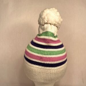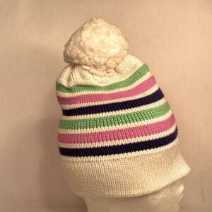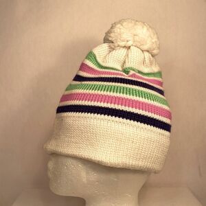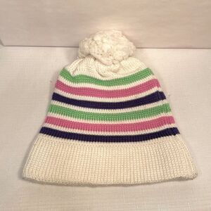 VINTAGE WHITE POM POM WITH GREEN/PINK/PURPLE STRIPES SKI HAT BY MEISTER EVC