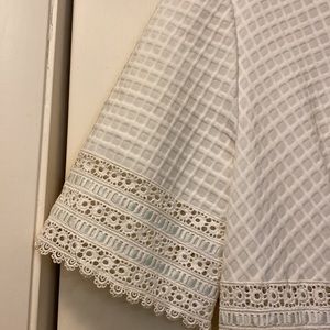 Length 37”, armpit to armpit 18”, sleeve length 11” and waist (front measurement only) 17.5”. Last photo shows a small separation in a section of the decorative border which may be able to be sewn.