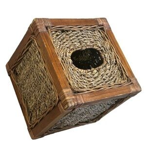 Vintage Wicker & Twine Tissue Box Cover Bohemian Shabby Chic Boho Farmhouse. Condition is preowned. Item is constructed of wicker and twine. Tissue box cover measures approximately 6”L x 6”W x 6”H.