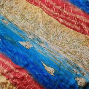 THE KAFTAN HAS A STUNNING NAUTICAL BEACH THEME. THERE ARE SEASHELLS AND DUNE GRASS PRINTED ON IT. THE SIZE IS “ONE SIZE FITS MOST”.