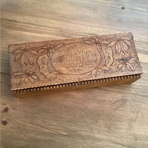 VINTAGE WOOD PYROGRAPHY HANDMADE HINGED GLOVE BOX
