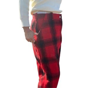 These vintage wool pants are designed in a classic buffalo plaid pattern with a bold red and black color scheme. They feature a relaxed fit with a zip closure and come in a size 32 waist and 30 inseam. Ideal for skiing, hunting, or outdoor activities, these pants offer both style and functionality with features like pockets, moisture-wicking material, and thermal insulation. Made of 100% wool, they provide warmth and comfort during winter, fall, and spring seasons, catering to activities such as skiing, snowboarding, and snowshoeing.