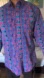 Vibrant shirt with geometric patterns in purple, blue, and orange. Perfect for a bold look and casual hanging out.