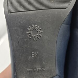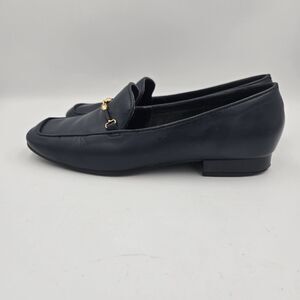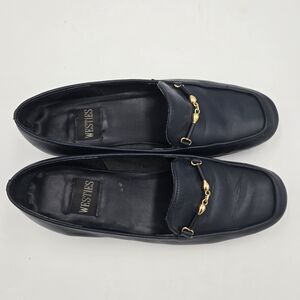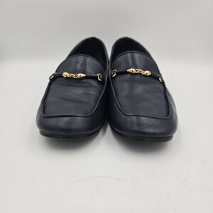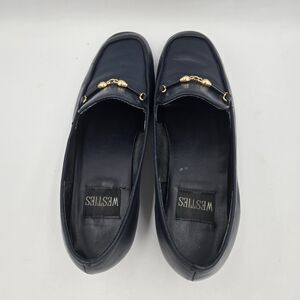 Vintage Westies "Misty" Loafers in a classic navy blue. These stylish flats feature a gold-tone horsebit or chain detail across the vamp, giving them a timeless look. Made in Brazil with a leather upper, they are a US Size 6M. Perfect for a retro, classic, or preppy style, offering comfort and sophistication. Women's footwear. Minimal heel. Excellent vintage condition.