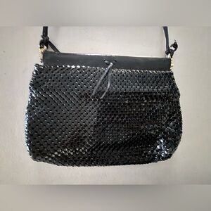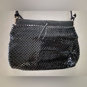 VTG Whiting & Davis, metal mesh shoulder bag. The handbag opens with a metal frame. 1- pocket in the interior. Fully lined interior. Leather straps tie onto bag. Very nice, retro bag. Good, used condition.