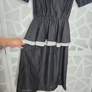 VINTAGE Womens Black/White Polka Dot Twee Peplum Midi Dress Retro Handmade Costume Rockabilly Pin up