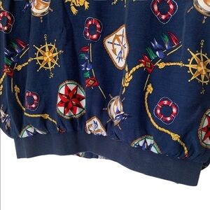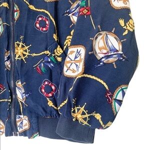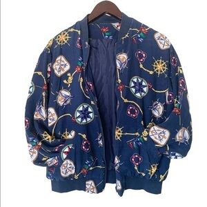 Ahoy, matey! This one-of-a-kind jacket is the perfect addition to your closet. So many options for this gem. Perfect mix between a bomber jacket and windbreaker style. More of a fabric-like material rather than windbreaker material though. Wear as a swim suit cover-up on your next vacation, or for those chilly summer evenings with your favorite pair of jeans.