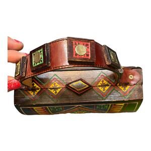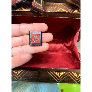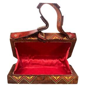 Vintage Wood Bag Hand Carved Diamond Shapes Leather Handle Fabric Mini Hexagon