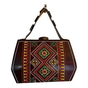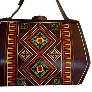 VINTAGE Wood Bag Hand Carved Diamond Shapes Leather Handle Fabric Mini Hexagon