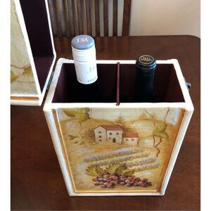 This is a beautiful vintage wooden (or wood composite) double-bottle wine holder/carrier. It has heavy antique brass hardware and is pristine inside. (I think it was used once – when it was new.) It’s 14” x 8” x 5” with a domed top. It’s lined in burgundy velour. It’s antique and (perhaps hand?) painted. The scene appears to be a French vineyard and château. The bottle divider can be totally removed. I can see this used as a planter with the top open, since the interior is so pretty. I don’t know it’s age, but I can’t remember when it wasn’t sitting in my sisters home.  excellent vintage condition. Nice piece! 🍷