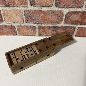 VINTAGE Wood Dominoes Set Metal Trim Handmade Collectible Complete Set 28 Pieces