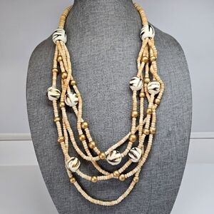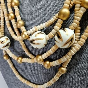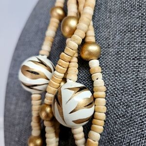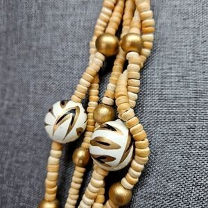 Beautiful vintage wooden bead necklace. Natural wood colors mixed with painted gold and animal print beads. Back hook close. Measures about 28". Purchased from an estate and no visible maker's mark. Excellent condition and smoke-free home.