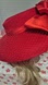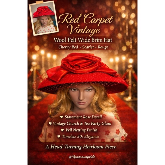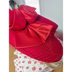 Keywords: red hat, wide brim, church hat, formal hat, special occasion, satin rose, veil, statement hat, fashion hat, dress hat, elegant, glamorous, racing attire, wedding guest, Kentucky derby hat