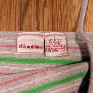 VINTAGE XHILIRATION GREY TANK TOP WITH PINK AND GREEN STRIPES. THE TANK TOP IS FROM THE EARLY 2000's. STRAPS CAN BE ADJUSTED BASED ON HOW YOU TIE THEM.