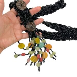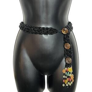 VINTAGE Y2K BEADED TASSEL BELT BLACK BRAIDED BOHO WHIMSIGOTH FAIRY SIZE L XL EUC