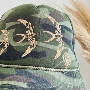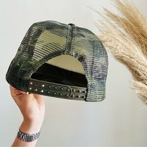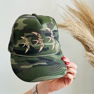 VINTAGE Y2K Green Black Camo Print Gold Glitter Bird Trucker Mesh Snap Back Hat