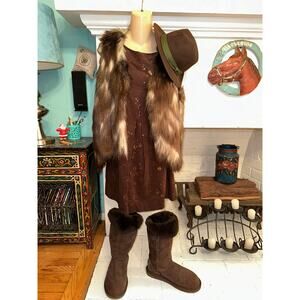 CUTEST BROWN VELVETY PINWALE CORDUROY DRESS FROM LE SHACK. SEQUIN DECORATION AND BACK NECK BOW. KIND OF A MOD SIXTIES STYLE. SIZE 6. MEASUREMENTS IN PHOTOS. FIRST PHOTO IS FOR STYLING ONLY - FUR VEST, BOOTS AND HAT ARE AVAILABLE SEPARATELY