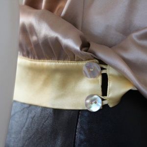Super cute, genuine Y2K beauty! Tank is a lovely blush pink color with black lace floral design. Tank has dainty spaghetti straps and fun ruffled neckline with raw edge silk. Bottom hem is a contrast buttery yellow color and closes with two buttons on the side.
