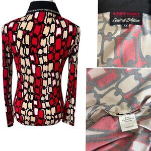 GORGEOUS SO UNIQUE 2000'S AESTHETIC FULL OF RHINESTONES ON THE COLLAR AND DOWN THE FRONT WITH A FUNKY RETRO PATTERN. SO CUTE FOR A RODEO, A NIGHT OUT, DATE NIGHT, WESTERN WEAR Y2K 2000'S DRESSY TOP! CAN BE WORN AS A BLOUSE/JACKET.