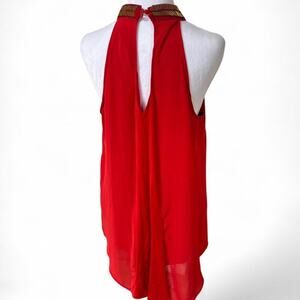 VINTAGE Y2K XOXO RED CUT OUT BEADED HALTER TOP LONG TANK BLOUSE LARGE. REALLY COOL UNIQUE DESIGN WITH TONS OF DETAILS!