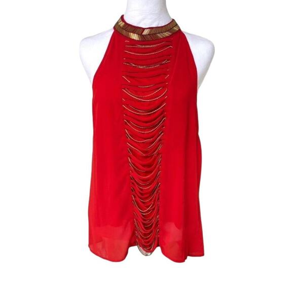 VINTAGE Y2K XOXO RED CUT OUT BEADED HALTER TOP LONG TANK BLOUSE LARGE. REALLY COOL UNIQUE DESIGN WITH TONS OF DETAILS!