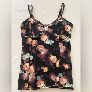 This vintage Y2K tank camisole is a whimsical piece featuring a moody floral print, sweetheart neckline and a bodice appearance done with visible stitching, and spaghetti straps. With a fairy and grunge theme, this sleeveless top is perfect for travel, parties, or casual wear. Made of spandex, modal and pima cotton fabric, it offers a lightweight and stretchy fit with adjustable straps for comfort. womens size M, this Decree brand top captures a nostalgic and edgy aesthetic.