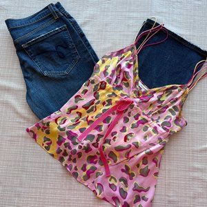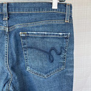 Quintessential Y2K denim wash w/fraying on hems & pockets