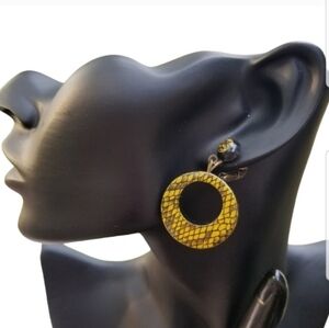 Fashionable vintage jewelry set with a vibrant yellow and black snakeskin pattern print. I believe the set is made of polymer but not quite sure. Necklace measures 54-3/4 inches in total length and is doubled up in pics. Necklace has a spring clasp closure. Bracelet measures 8 inches around inside and is bangle style. Earrings measure 1-5/8 inches in length and have clip on style backs. Set is in great condition.