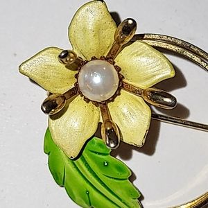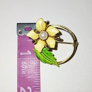 Pretty little vintage goldtone circle pin with a yellow enameled flower accented with a bright green leaf. In the center of the five-petalled flower is a large white faux pearl.