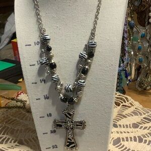Up for offer is this pretty Black and White Zebra patterned Cross necklace. Beads are an acrylic or plastic material.