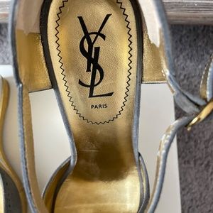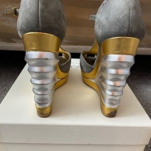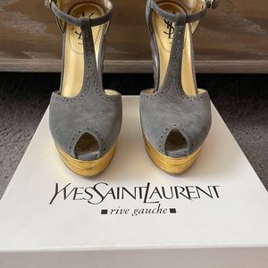 VINTAGE YSL Size 7.5 Grey suede gold/silver wedge with T/strap
