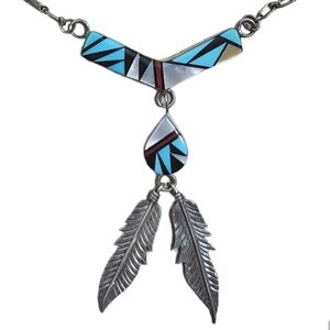 VINTAGE ZUNI MOSAIC INLAY NECKLACE with STERLING SILVER FEATHERS