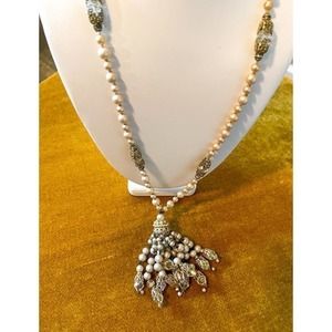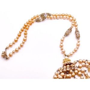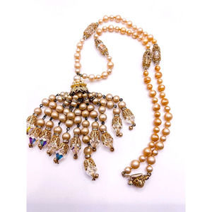 VINTAGE art deco tassel necklace faux pearls aurora borealis crystals dangle 18"