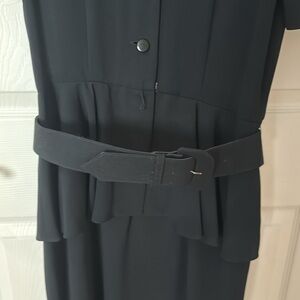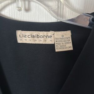 This sophisticated black sheath dress by Liz Claiborne features a flattering v-neckline and a notched collar, perfect for work or cocktail events. The short sleeves and buttoned design add a touch of elegance, while the midi length ensures a polished look. Includes belted front. Vintage Liz Claiborne size 8. Excellent condition. Smoke-free home.