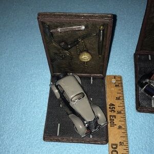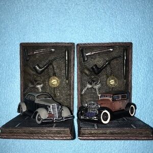 Made of ceramic and metal. No markings. Leather looking finish. Heavy to hold books in place. Great for the office. Great Father’s Day gift!