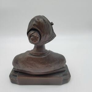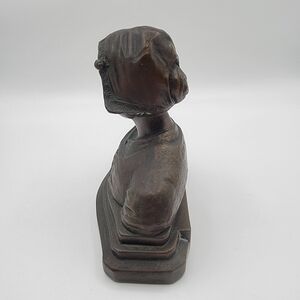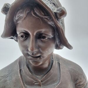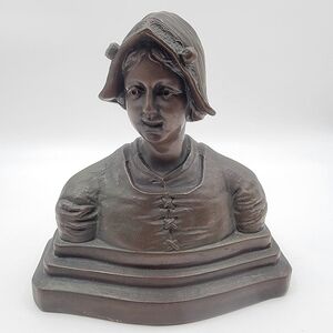 Pompeian Bronze Co. produced this stately statue of a Dutch lady. Meant to be a bookend; it is missing its other half, the Dutch gentleman. She is amazing on her own. It is perfect for sitting on a shelf or on top of a stack of books.