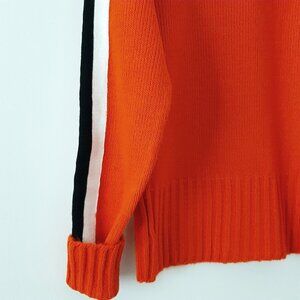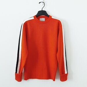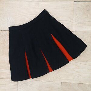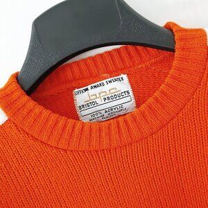 Colors are orange and black. The sweater is 100% acrylic and I imagine the skirt is polyester or acrylic or some sort of blend, as nearly all these garments were back in the 1970s. If you want to see more detail about the skirt, check out my sold listing entitled "RARE Vintage c. 1976 Cheerleading Uniform (Skirt) Sewing Kit [BRAND NEW SEALED]." This was a backup kit all cheerleaders had in case a skirt got torn, stained or lost.