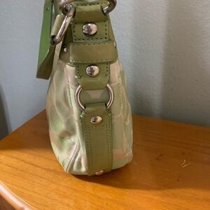 Vintage coach signature bag in canvas and leather with beautiful belted design. Very good condition inside and out is a beautiful spring green with silver hardware leather zipper pulls keychain ring inside top zip closure no rubbing on corners or side or bottom handle in good condition approximate measurements