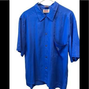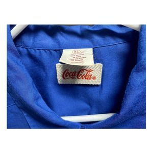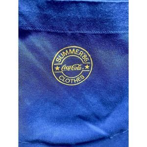 Coca-Cola Summer of 86 button-up shirt is a blue shirt with the Coca-Cola logo and Summer of 86 design printed in vibrant colors on the front and back. It may be made of lightweight material perfect for hot weather and has a collar and short sleeves, designed to be worn casually untucked.