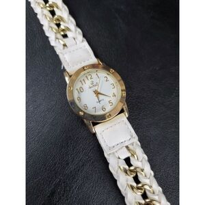 You are bidding on a Vintage decree Quartz Ladies Watch. White face, gold-tone hands and Arabic numerals with a long white leather and gold-tone strap wrap band with snaps.