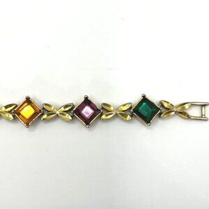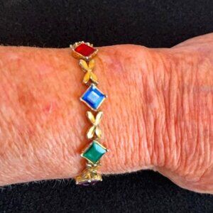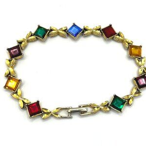 VINTAGE multi-colored diamond shaped faux gemstone gold-tone bracelet. Red, Yellow, Purple, Green, and blue. Pretty flower design in gold-tone. Hammered back.