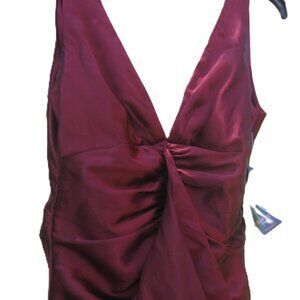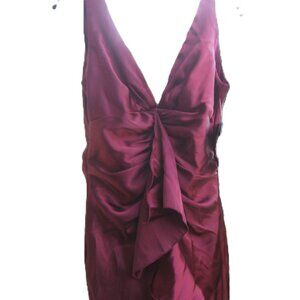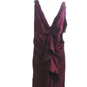 Stunning and unique ruffle front V neck vintage burgundy gown from Rampage, fully lined, made in USA size 3. Never worn, still has original tag attached. This is from the late 80's or early 90's and retailed for $98 then. Flattering, stylish, fitted look. Pictures don't do justice. See actual measurements below.