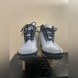 This has a listing for a pair of preowned VINTAGE Early 2000s Timberland Women's Euro-Dub Boots Cornflower Baby Blue 7.5. The suede does have some wear, may be able to clean it up some, tongue of one shoe has hard spot. Please see all photos for details as they are part of the description.