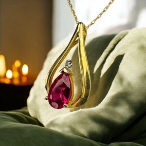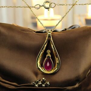 This is a gorgeous solid 10k Yellow Gold necklace with a mesmerizing 1 Carat pear cut and round cut vibrant ruby gemstone and diamond accent tear drop shaped pendant necklace. The solid 10k yellow gold chain is approximately 18inches long, pendant approximately 21mmx12mm. Weighs 1.6g.Main stone measures 9x5.2mm. Excellent anniversary gift for wife, girlfriend, july birthstone birthday gift for daughter, etc.!