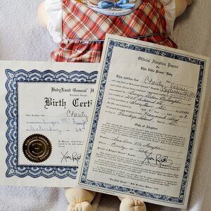 RARE-VINTAGE Xavier Roberts' "THE LITTLE PEOPLE" Girl "Cabbage Patch Kids" Doll- Charity Valerie (blonde hair w/ blue eyes) plus original, birth documents from "Babyland General Hospital".