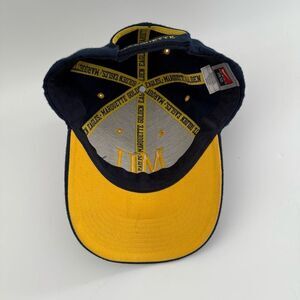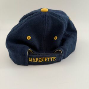 Navy blue gap with gold trim. Raised MU logo on the front, Nike swoosh on the side, and Marquette on the Velcro strap.