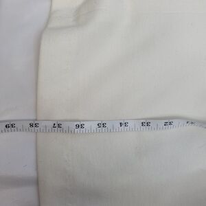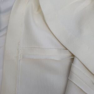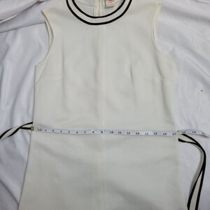 Vtg 1960s knit cream color sleeveless shift dress with tie belt. Some mild discoloration and pulls shown in photos. Polyester cotton. Please refer to measurements for fit.