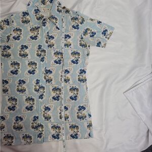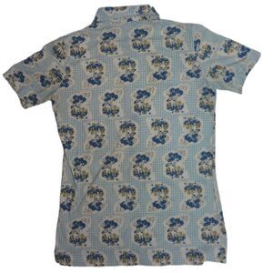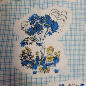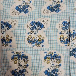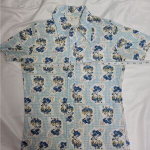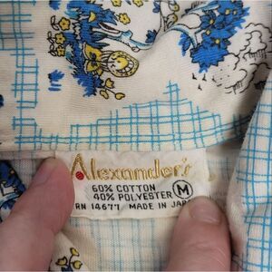 Vtg 1970s Alexander's blue plaid whimsical print disco dagger collar short sleeve button up shirt. Girl sitting under a tree surrounded by flowers and mushrooms print. Adorable! Made in Japan. Please refer to measurements for sizing. Cotton polyester.